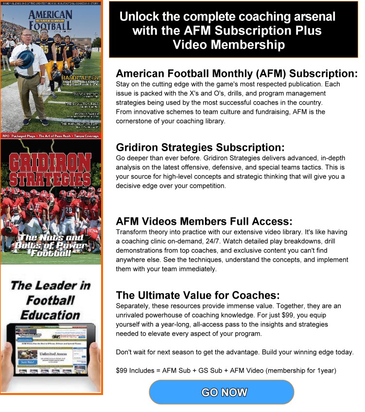 Stay on the cutting edge with the game's most respected publication. Each issue is packed with the X's and O's, drills, and program management strategies being used by the most successful coaches in the country. From innovative schemes to team culture and fundraising, AFM is the cornerstone of your coaching library.